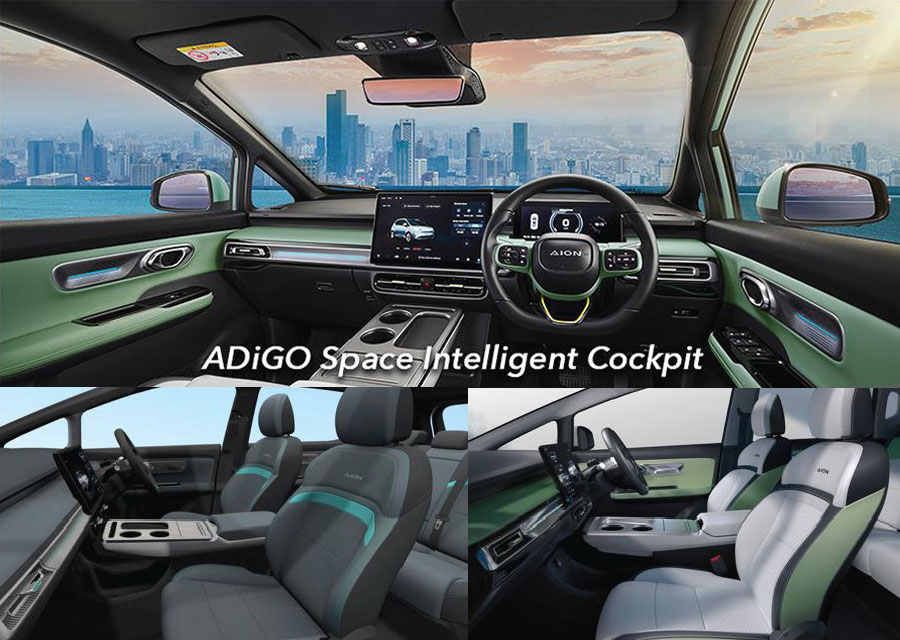 Interiornya tersedia I PEDAL (Electronic Pedals), keyless entry, 10,25 inci LCD instrument cluster, 14,6 inci touch screen display, Bluetooth handsfree phone system, 6 speakers, automatic air conditioning, air filter (PM2.5), second row air conditioning vent, microfiber leather-trimmed steering wheels, audio & video system, multifunction steering wheel, PVC leather-trimmed seats, 6-way power adjustable driver seat, panoramic sunroof (with electric sunshades), second row 40/60 split-folding seat, ambient light, front row 12V power outlet, front and second row USB Port, interior rearview mirror with USB port (5V) dan front and rear windows one-touch up & down (anti-pinch).